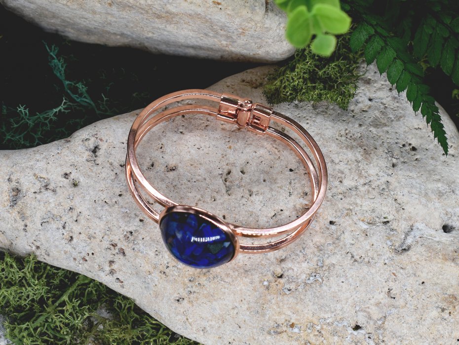 Bransoletka z ręcznie wykonanym kaboszonem z żywicy i drobnych kamieni lapisu lazuli. Brak możliwości regulacji.