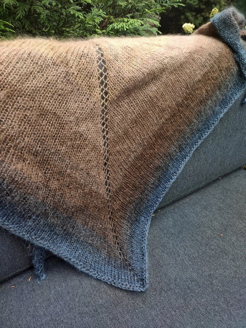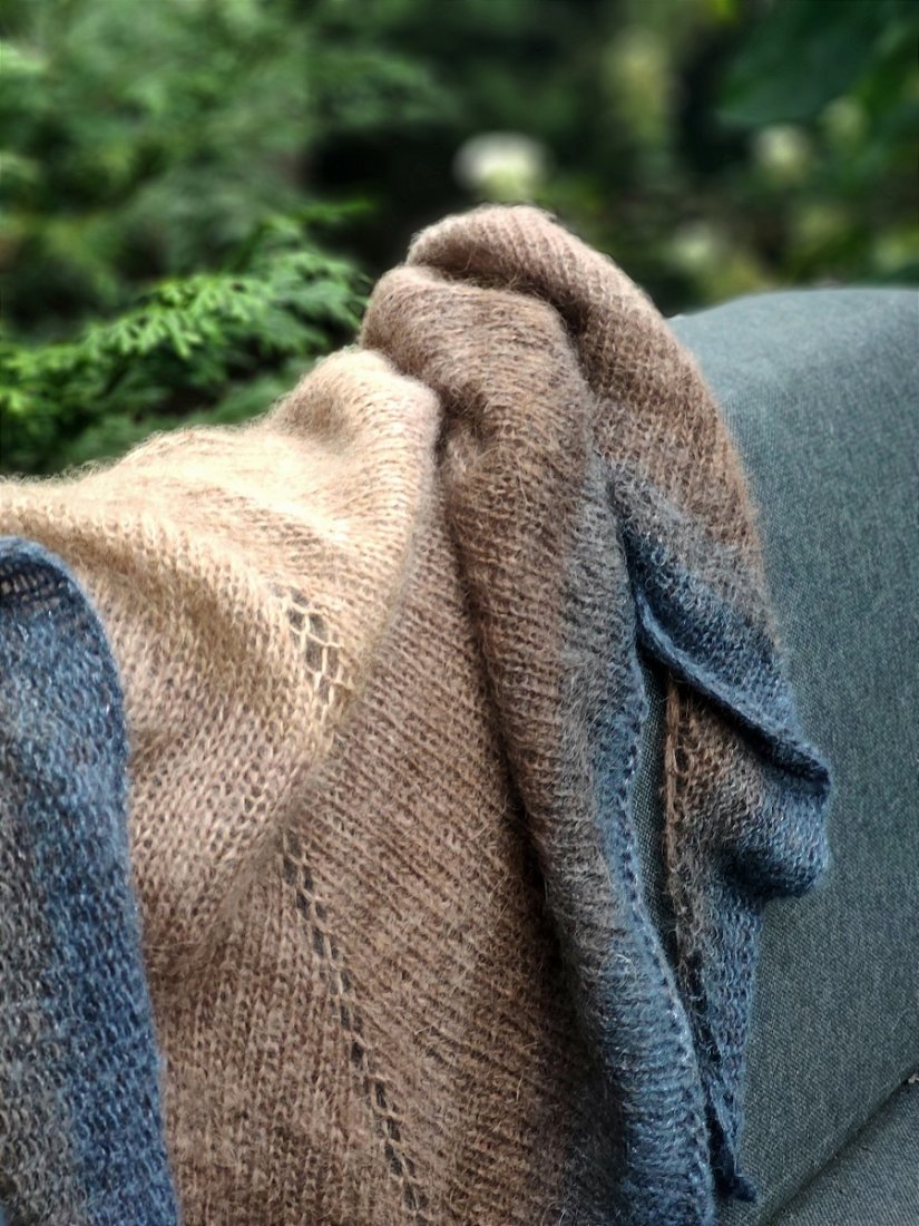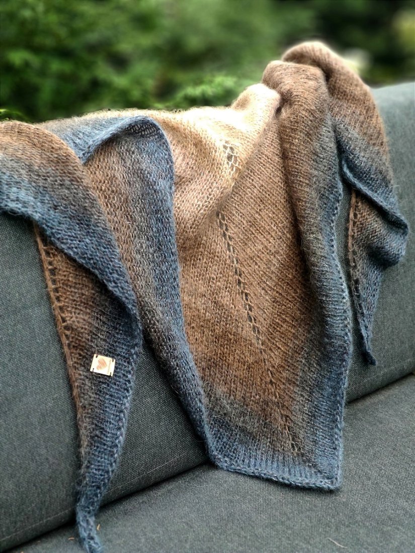 Ciepła, miękka, puszysta i bardzo lekka chusta, wykonana ręcznie na drutach z trzech cieniutkich cudownych włókien.