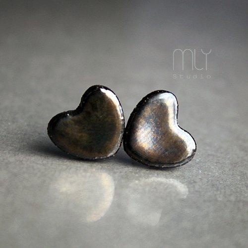 Ceramiczne kolczyki w formie sztyftów, ręcznie wykonane z delikatnej gliny kamionkowej, jednostronnie szkliwione stalowosrebrnym szkliwem z efektem plamek i pięknym metalicznym połyskiem, na sztyftach w kolorze srebrnym.Średnica ok. 12mm.. Polecam
