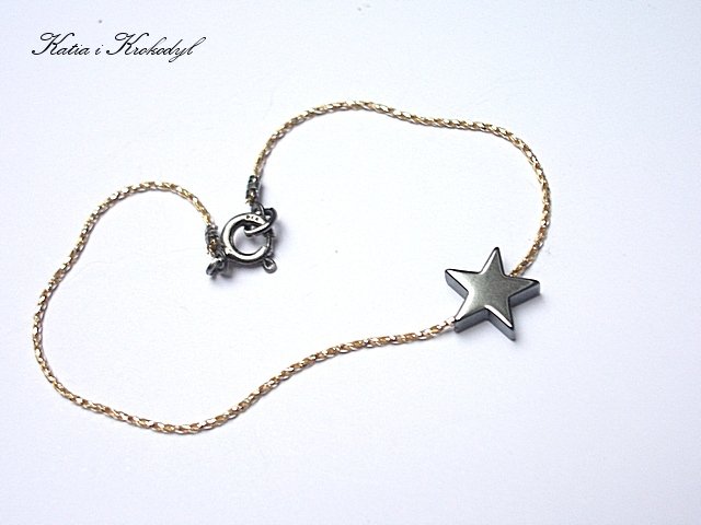 Delikatna bransoletka wykonana w całości ze srebra i srebra pokrytego 24k złotem [pr. 925] w połączeniu z hematytową gwiazdką . Srebro częściowo oksydowane i przetarte. Całkowita długość bransoletki około 18,5cm Biżuteria ozdobnie zapakowana.