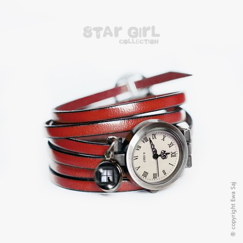 Oryginalna bransoletka - zegarek z kolekcji Star Girl i pełnia księżyca. Skórzany rzemyk w kolorzeczerwonym szeroki na 5 mm sześciokrotnie owija nadgarstek. Zapięcie umożliwia regulację szerokości. Pasuje na nadgarstek 13-17 cm. Wielkość tarczy zegarka 25 mm, średnica charmsa 12 mm. Charms i zegarek w kolorze antycznego srebra.