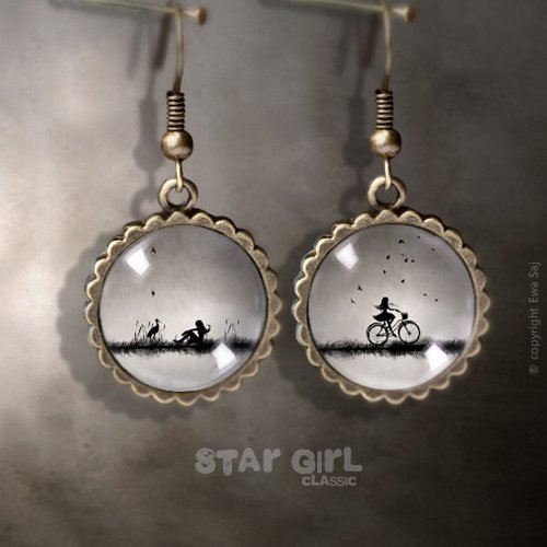 Oryginalne, zaczarowane, romantyczne kolczyki z kolekcji Star Girl Classic. Kolczyki zawierają miniaturki grafik Opowieść ukryta pod szklaną kopułą przeźroczystego szkiełka, umieszczone na stylowym medalionie w kolorze antycznego złota. Długość kolczyków 3,8 cm średnica graficznej miniatury 16 mm. wybierz też naszyjnik z kolekcji Star Girl do kompletu.