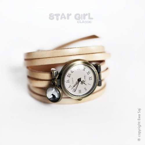 Oryginalna bransoletka - zegarek z kolekcji Star Girl Classic. Skórzany rzemyk w kolorze naturalnym szeroki na 5 mm sześciokrotnie owija nadgarstek. Zapięcie umożliwia regulację szerokości. Wielkość tarczy zegarka 25 mm, (zegarek kwarcowy z wymienną baterią) średnica charmsa 12 mm. Zapięcie, czarms i zegarek w kolorze antycznego złota. Tarcza i zapięcie sygnowane autorskim podpisem.