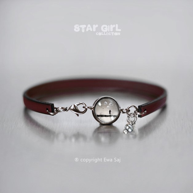 Oryginalna delikatna, kobieca bransoletka z grafiką mojego autorstwa. Grafika została ukryta pod 10 mm wypukłym szkiełkiem. Pasek z naturalnej skóry w kolorze blackburry ma szerokość 5 mm, dodatki w kolorze ciemnego srebra. Idealna na nadgarstek 14,5 - 15,5 cm. Zrób sobie prezent! Wolny od niklu i ołowiu - antyalergiczny. copyright Ewa Saj. All Rights Reserved.