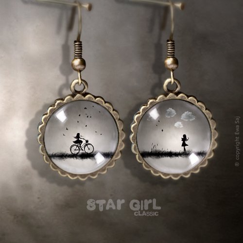 Oryginalne, zaczarowane, romantyczne kolczyki z kolekcji Star Girl Classic. Kolczyki zawierają miniaturki grafik Opowieść ukryta pod szklaną kopułą przeźroczystego szkiełka, umieszczone na stylowym medalionie w kolorze antycznego złota. Długość kolczyków 3,8 cm średnica graficznej miniatury 16 mm. wybierz też naszyjnik z kolekcji Star Girl do kompletu.