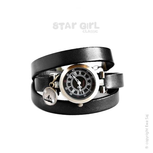 Oryginalna bransoletka - zegarek z kolekcji Star Girl Classic . Skórzany rzemyk w kolorze czarnym szeroki na10 mm trzykrotnie owija nadgarstek.