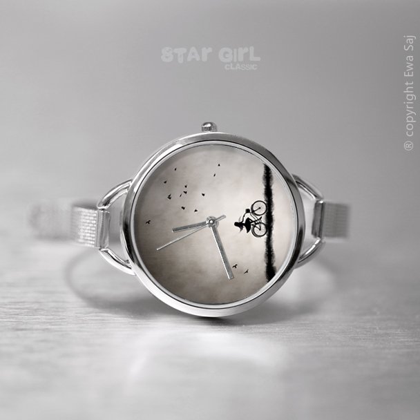 Niepowtarzalny, autorski zegarek z limitowanej kolekcji Star Girl. Wielkość tarczy zegarka 38 mm, szerokość paseczka 8 mm. Passeczek to delikatna metalowa bransoletka z klasycznym zapięciem (na małą sprzączkę).
