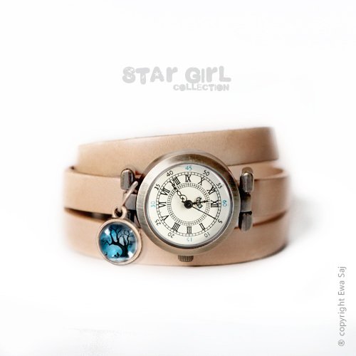 Oryginalna bransoletka - zegarek z kolekcji Star Girl i Bocian. Skórzany rzemyk w kolorze naturalnym szeroki na 10 mm trzykrotnie owija nadgarstek. Wielkość tarczy zegarka 25 mm, średnica charmsa 12 mm. Zapięcie, charms i zegarek w kolorze antycznego złota. Idealna na nadgarstek 14 - 15 cm.