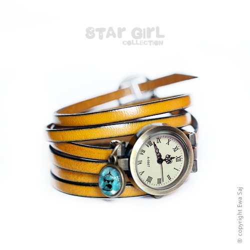 Oryginalna bransoletka - zegarek z kolekcji Star Girl. Skórzany rzemyk w kolorze żółtym szeroki na 5 mm sześciokrotnie owija nadgarstek. Zapięcie umożliwia regulację szerokości. Pasuje na nadgarstek 13-16 cm. Wielkość tarczy zegarka 25 mm, średnica charmsa 12 mm. Charms i zegarek w kolorze antycznego złota. Wolny od niklu i ołowiu - antyalergiczny. copyright Ewa Saj. All Rights Reserved.