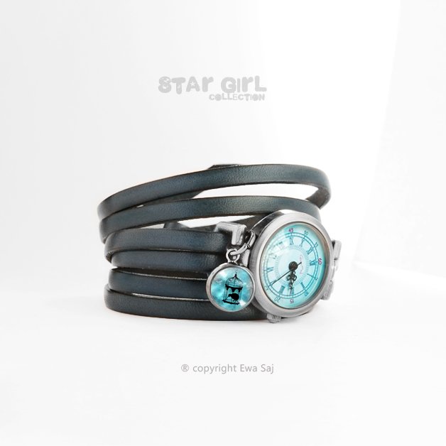 Oryginalna bransoletka - zegarek z grafiką Star Girl. Skórzany rzemyk w kolorze ciemno niebieskim szeroki na 5 mm sześciokrotnie owija nadgarstek. Zapięcie umożliwia regulację szerokości. Wielkość tarczy zegarka 25 mm, średnica charmsa 12 mm. Zapięcie, charms i zegarek w kolorze antycznego srebra. tarcza sygnowana moim podpisem. Zegarek posiada mechanizm kwarcowy oraz wymienną baterię.
