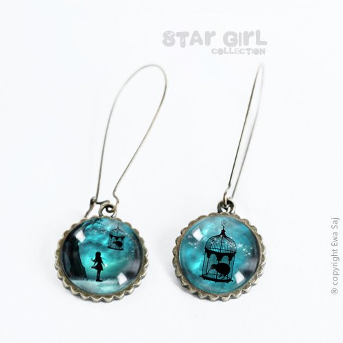 Oryginalne, zaczarowane, romantyczne kolczyki. Miniaturki moich grafik ukryte pod szklaną kopułą przeźroczystego szkiełka, umieszczone na stylowym medalionie w kolorze antycznego złota o średnicy 19 mm. Wielkość graficznej miniatury 16 mm. Długość kolczyków 5,5 cm