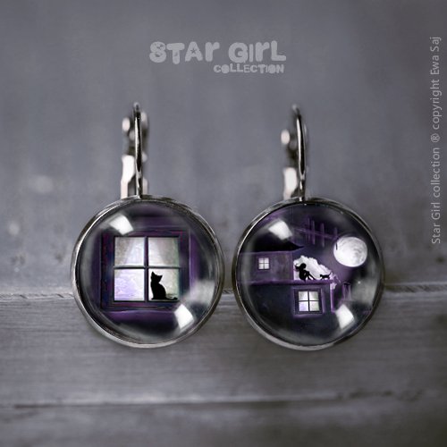 Oryginalne, zaczarowane, romantyczne kolczyki. Miniaturki moich grafik ukryte pod kopułą organicznego szkiełka. Długość kolczyków 3 cm średnica graficznej miniatury 18 mm. baza kolczyków w kolorze ciemnego srebra( gun metal )