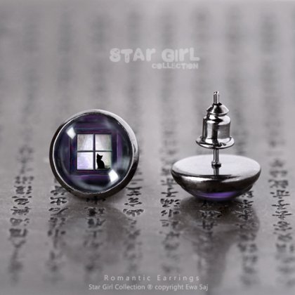Malutkie, pełne czaru, oryginalne, zaczarowane, romantyczne kolczyki-wkręty . Miniaturki moich grafik (2 x kotek) zmniejszone do wymiaru 10 mm. Ukryłam je niczym maleńki sekret pod szklaną kopułą organicznego szkiełka. Sztyft w kolorze ciemnego srebra (gun metal) z idealnie dopasowaną zatyczką. Średnica kolczyka 12 mm.