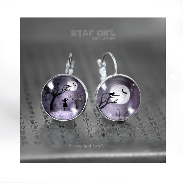Oryginalne, zaczarowane, romantyczne kolczyki z kolekcji Star Girl. Miniaturki moich grafik ukryte pod szklaną kopułą organicznego szkiełka. Długość kolczyków 3 cm średnica graficznej miniatury 16 mm. baza kolczyków w kolorze srebra.
