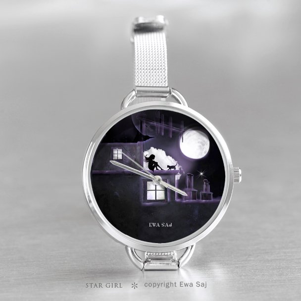 Niepowtarzalny, autorski zegarek z limitowanej kolekcji Star Girl Classic. Wielkość tarczy zegarka 36 mm, szerokość paseczka 8 mm. Passeczek to delikatna metalowa bransoletka z klasycznym zapięciem (na małą sprzączkę).