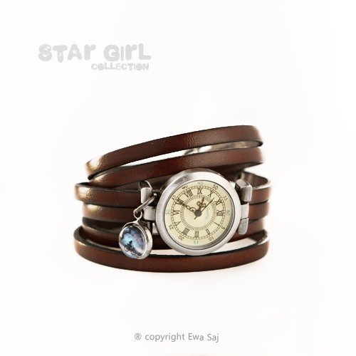 Oryginalna bransoletka - zegarek z Star Girl. Skórzany rzemyk w kolorze czekoladowym szeroki na 5 mm sześciokrotnie owija nadgarstek. Zapięcie umożliwia regulację szerokości. Wielkość tarczy zegarka 25 mm, średnica charmsa 12 mm. Zapięcie, charms i zegarek w kolorze antycznego srebra. Tarcza i zapięcie sygnowane autorskim podpisem.