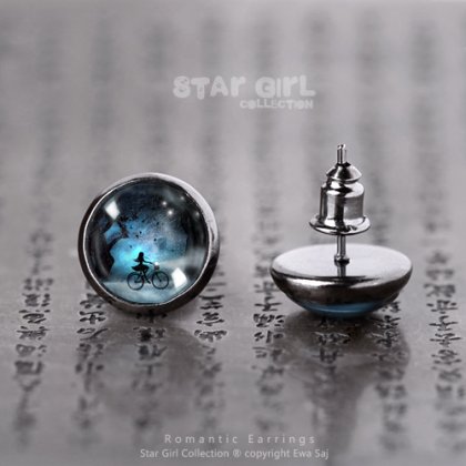 Malutkie, pełne czaru, oryginalne, zaczarowane, romantyczne kolczyki-wkręty . Miniaturki moich grafik (2 x Star Girl i Rower)zmniejszone do wymiaru 10 mm Ukryłam je niczym maleńki sekret pod szklaną kopułą organicznego szkiełka. Sztyft w kolorze ciemnego srebra (gun metal) z idealnie dopasowaną zatyczką. Średnica kolczyka 12 mm.