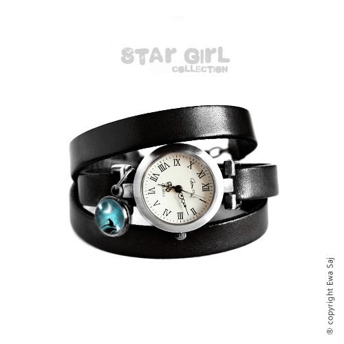 Oryginalna bransoletka - zegarek z kolekcji Star Girl . Skórzany rzemyk w kolorze czarnym szeroki na10 mm trzykrotnie owija nadgarstek.