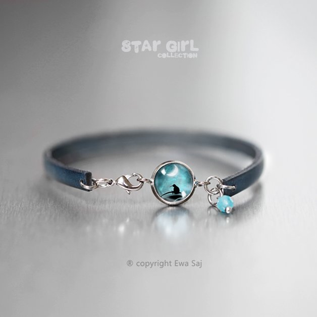 Oryginalna delikatna, kobieca bransoletka z kolekcji Star Girl. Grafika została ukryta pod 10 mm wypukłym szkiełkiem. Pasek w kolorze turkusowo - granatowym, ma szerokość 5 mm, dodatki w kolorze ciemnego srebra. Idealna na nadgarstek 14,5 - 15,5 cm. Zrób sobie prezent! Wolny od niklu i ołowiu - antyalergiczny. copyright Ewa Saj. All Rights Reserved. Jeśli potrzebujesz inny rozmiar - napisz do mnie.