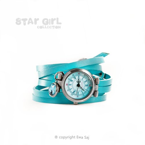 - Oryginalna bransoletka - zegarek z kolekcji Star Girl, Kiwi i szybka jazda. Skórzany rzemyk w kolorze turkusowym szeroki na 5 mm sześciokrotnie owija nadgarstek. Zapięcie umożliwia regulację szerokości. Pasuje na nadgarstek 13-17 cm. Wielkość tarczy zegarka 25 mm, średnica charmsa 12 mm. Charms i zegarek w kolorze ciemnego srebra. Wolny od niklu i ołowiu - antyalergiczny.
