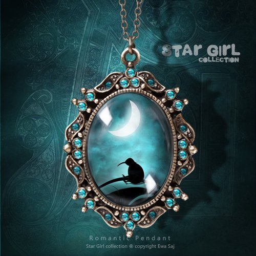 Miniaturka mojej grafiki, niczym sekret ukryta pod szklaną kopułą przeźroczystego szkiełka, oprawiona w niezwykle strojną Wiktoriańską ramkę w kolorze antycznego złota. Zdobi ją 26 turkusowych kryształków. Długość medalionu 3,5 cm, szerokość 2,8 cm. Wielkość fotograficznej miniatury 18 x 25 mm. Zawieszony na 45 cm łańcuszku. Zrób sobie prezent, wybierz oryginalny, zaczarowany naszyjnik.
