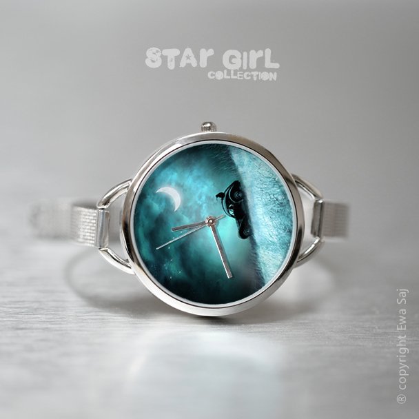 Niepowtarzalny, autorski zegarek z limitowanej kolekcji Star Girl. Wielkość tarczy zegarka 38 mm, szerokość paseczka 8 mm.