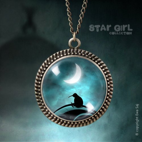 Romantyczny, oryginalny, zaczarowany medalion.Miniaturka mojej grafiki - krótka opowieść o tym jak Star Girl marzenia Kiwi spełniała, ukryta pod szklaną kopułą przeźroczystego szkiełka.Umieszczona na stylowym medalionie w kolorze antycznego złota. Srednica medalionu 3,8 cm, wielkość graficznej miniatury 3 cm. Medalion zawieszony jest na długim na 80 cm. łańcuszku.