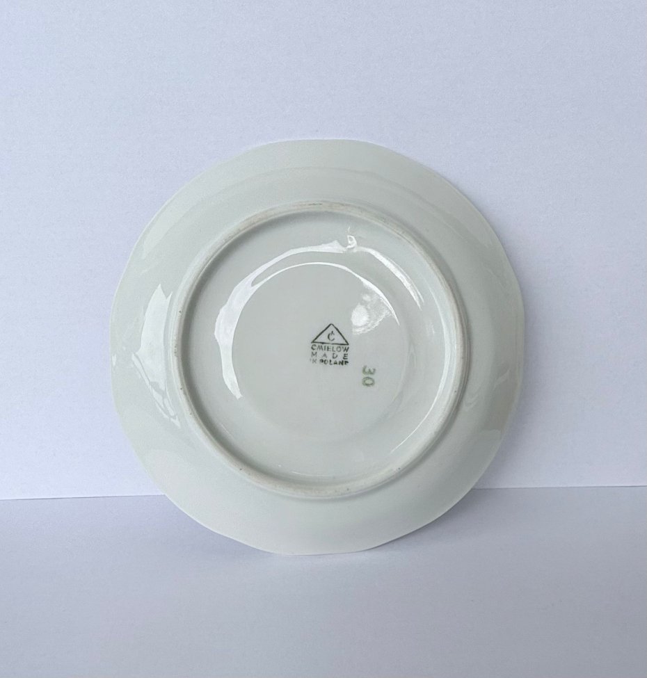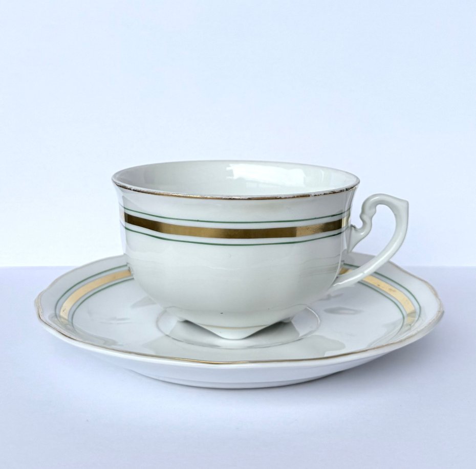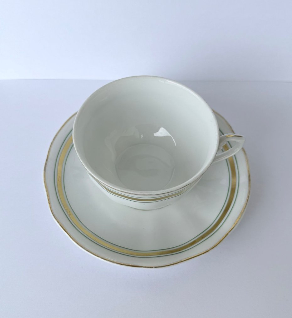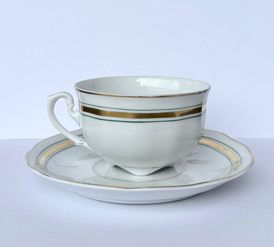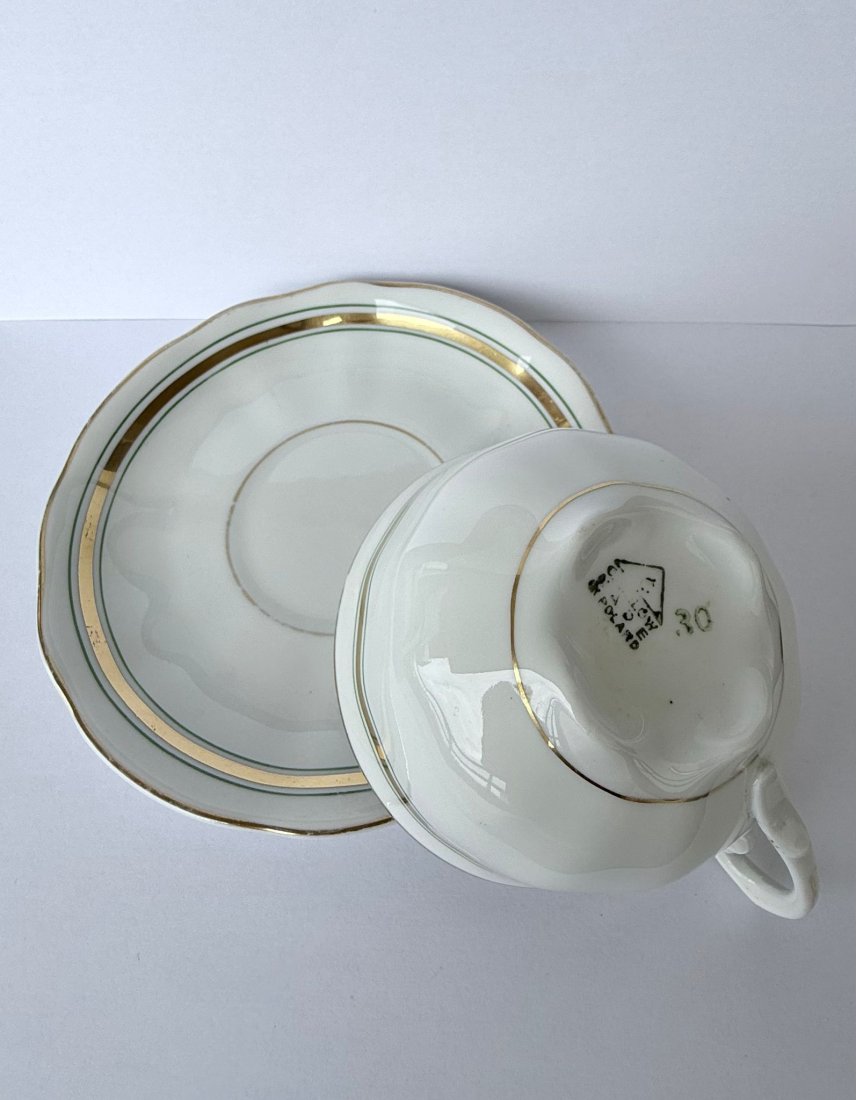 Stary, stylowy zestaw wykonany z wysokiej jakości białej porcelany, stanowiący doskonały przykład polskiego wzornictwa mid-century. Projekt wyróżnia się nowoczesną, linearną dekoracją w postaci szerokiego złotego pasa ujętego w zielone linie oraz charakterystycznym dla epoki, dekoracyjnym uchem o geometrycznym kształcie. Klasyczna, lekko pękata forma na niskiej stopce i subtelnie falowany rant spodka podkreślają ponadczasową elegancję serwisu. Przedmiot sygnowany na spodzie znakiem renomowanej wytwórni Ćmielów, zachowany w bardzo dobrym stanie vintage, bez uszkodzeń z naturalnymi, delikatnymi przetarciami złoceń na rantach.