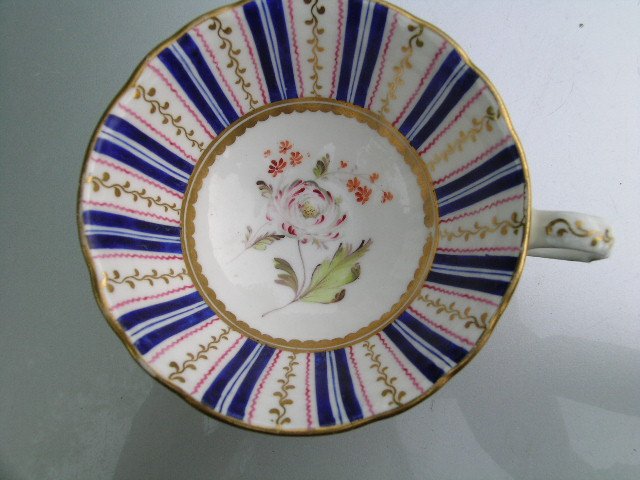 Stara,ręcznie wewnątrz malowana Porcelanowa Filiżanka. Duża,szlachetna,sygnowana ręcznie tylko numerycznie - pięknym,dawnej daty pismem - N 3035. Bardzo efektowna.Ciepła biel porcelany i kobalt i złoto...w graficzno-flosytycznej odsłonie; jak mandala zbiegające się ku środkowi wzory...a wewnątrz delikatnymi pociągnięciami pędzla ...ni róża to ni piwonia...Lekko ryflowany rant. Wykończenie błyszczące,