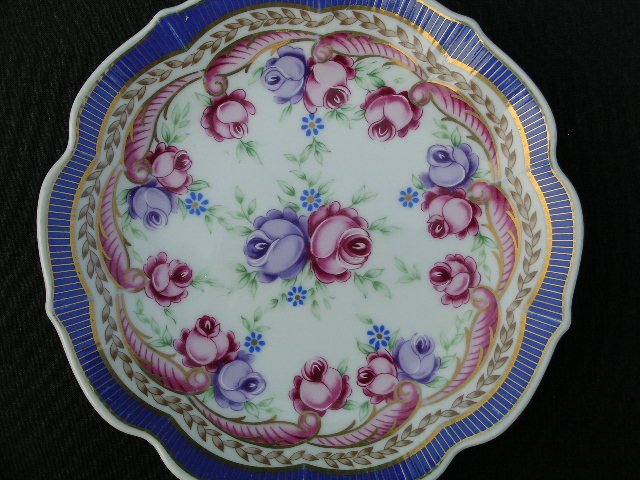 Wytwornie kwiatowy, kobiecy talerzyk śniadaniowy z bogatym kwiatowym zdobieniem w ciekawej kolorystyce. Malatura lekko fakturowa, nieprawdopodobnie precyzyjna, częściowo ręcznie podmalowywana. Rant falbanowany, złocenia i satynujące szkliwienie. Nie sygnowany. 19 x 2,5 cm. Stan zachowania dobry; lekkie przetarcia na wypukłościach i drobne ślady użytkowania.