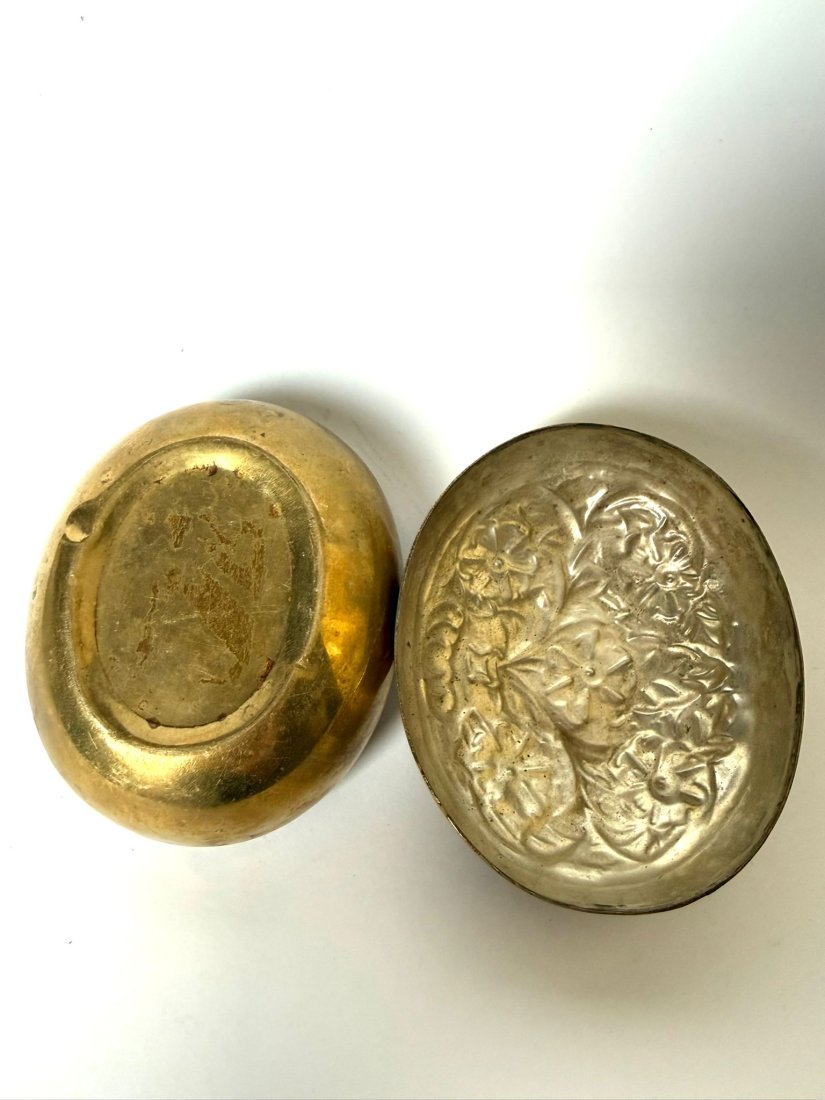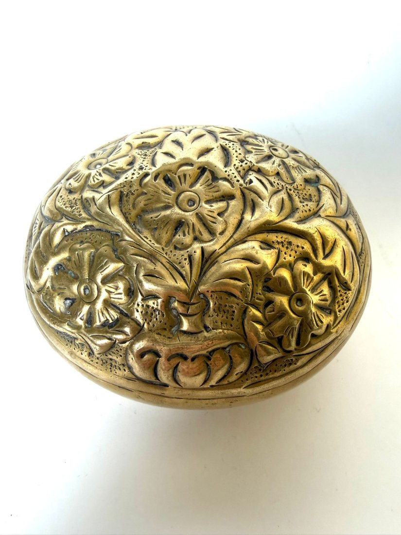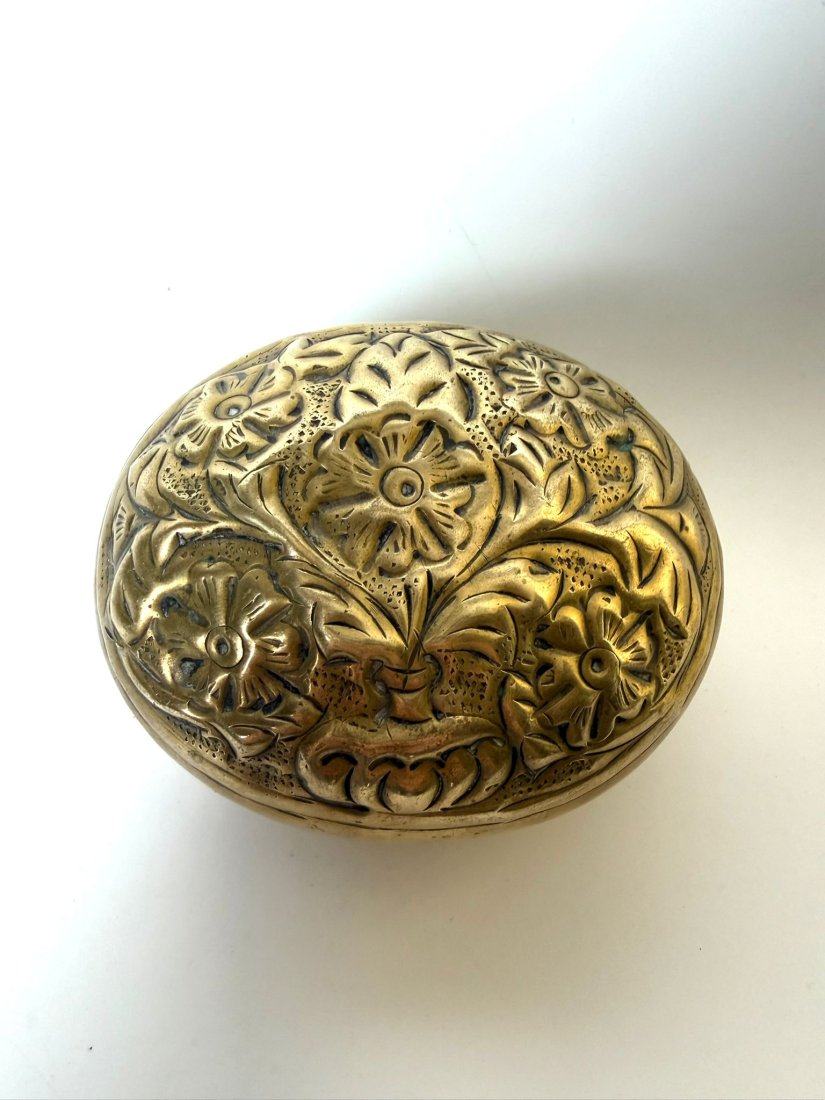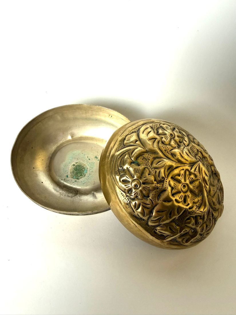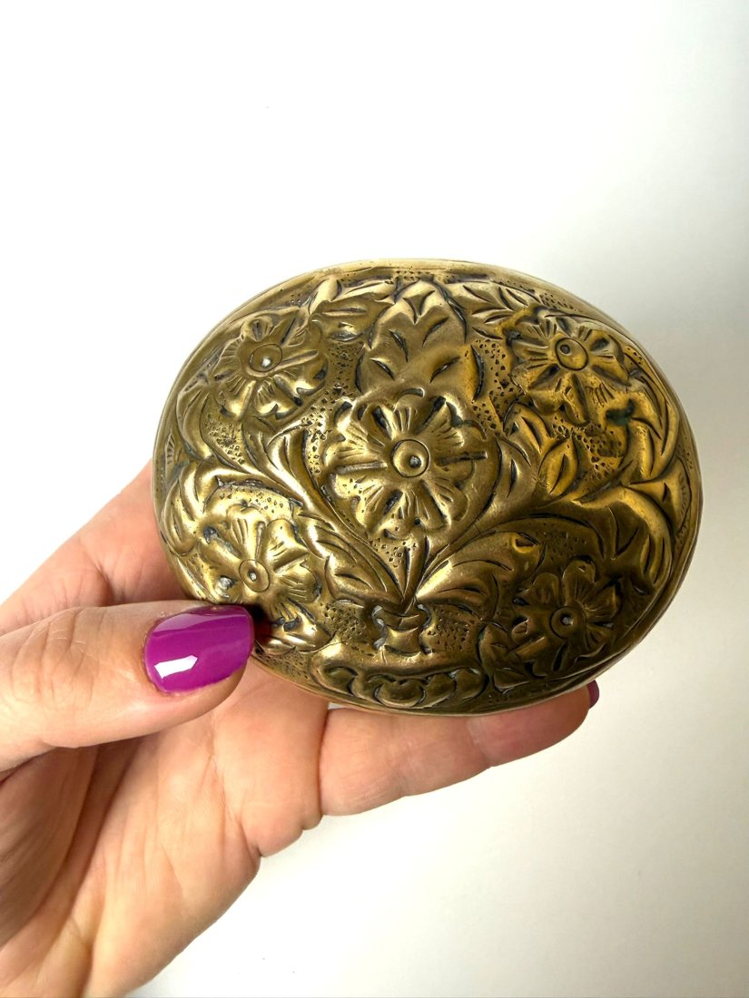 Wyjątkowe, stare puzderko (pudełeczko) wykonane z mosiądzu, które zachwyca kunsztem dawnego rzemiosła. Przedmiot ma owalny kształt i doskonale leży w dłoni, co czyni go idealnym schowkiem na drobne kosztowności lub biżuterię.
