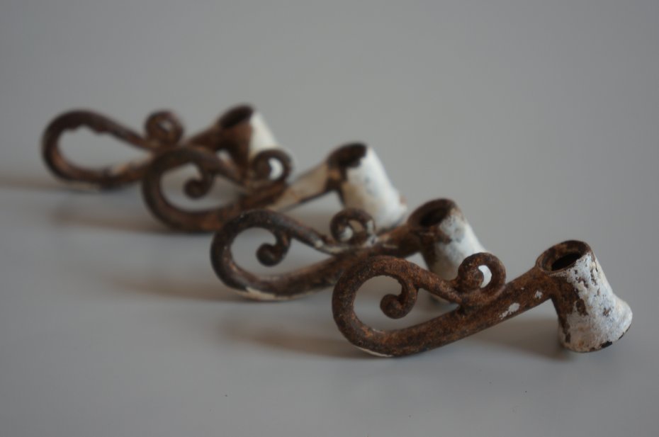 Cztery stare, zabytkowe uchwyty okienne typu “Monkey Tail" (lub “małpi ogon"). Często spotykane w zabytkowych nieruchomościach i domach w stylu wiejskim. Wykonane ze stali. Ślady korozji. Widoczne resztki białej farby. Mają charakterystyczny, ozdobny kształt z esowatymi zakrętami na końcu, co nadaje im dekoracyjny charakter. Służyły do zamykania okien. Pomimo zniszczeń, zachowały swój historyczny urok, świadcząc o dawnej estetyce i rzemiośle. Stan vintage.