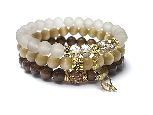 Komplet trzech bransoletek wykonanych z naturalnych kamieni: jadeity [8mm],uleksyty ,szklane matowe kuleczki [8mm] ,kryształki [8mm] ,kuleczka shamballa wysadzana kryształkami Swarovskiego [8mm] oraz elementów metalowych w kolorze złotym. Bransoletki pasują na nadgarstek 15 - 16,5cm. Biżuteria ozdobnie zapakowana.