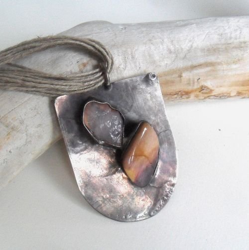Wisior autorski z surowym kwarcem.Miedz,patynowana cyna,kamienie,lniany sznur.Wymiary 7,5 na 5cm.