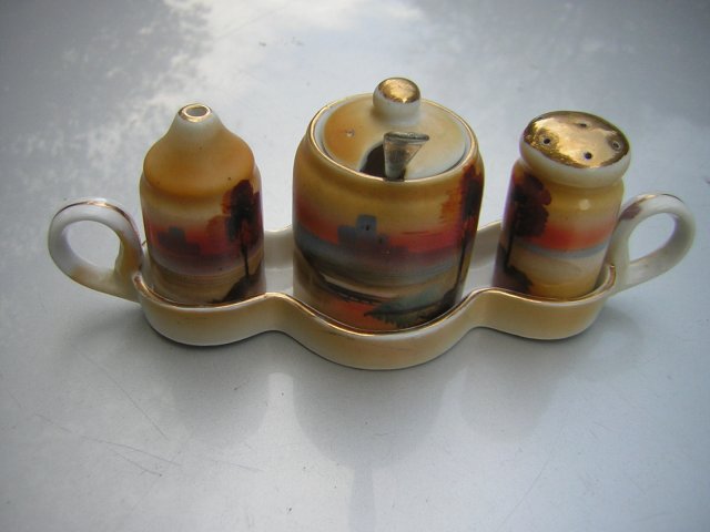 Porcelanowy kabaret ręcznie malowany. Sygnowany CHIKARAMACHI MADE IN JAPAN. Piękna rzecz i rzadko spotykana w tak dobrym i kompletnym stanie zachowania. Uchowała się nawet przykrywka . Zestaw składa się ze specjalnie profilowanej tacki - podstawki z uszkami szer. 16,5 x 5,5 dół 12 x 5 wys. 3 / niecałe 1,5 cm , solniczki z siedmioma dziurkami od góry i naturalnym korkiem od spodu- dół 2,5 góra 2,5 wys. 5 cm , pieprzniczki z jedną sporą dziurką i plasticzaną zatyczką od spodu - dół 3 cm wys. 5 , 5 cm , oraz z pojemnika z przykrywką różnorakiego zastosowania / z założenia pewnie na chrzan, lub paprykę / . Pojemniczek większy od solniczki i pieprzniczki, przykrywka z rantem zabezpieczającym przed spadaniem I z dziurką na łyżeczkę. - dół nie całe 4,5 góra 4 otwór 2,5 wys calkowita z przykrywką 6 cm, bez nie pełne 5 cm . Dokładam odpowiednio stareńką, maleńką łyżeczkę platerowaną 8 x 1,5 - sygnowana nie bardzo czytelnie. Cały zestaw sygnowany, solniczka i pieprzniczka tylko made in japan. Porcelana nie wygląda na gatunek pierwszy, drobne wady wykonania, ale bez pęknięć I uszczerbków. Całość ręcznie malowana w wykończeniu satynowo -,matowym. Ciekawe złożenie barw, kojarzące się z jesienną urodą pustyni. ..hmmm... Fragmenty białe satynowo - błyszczące. Złocenia.