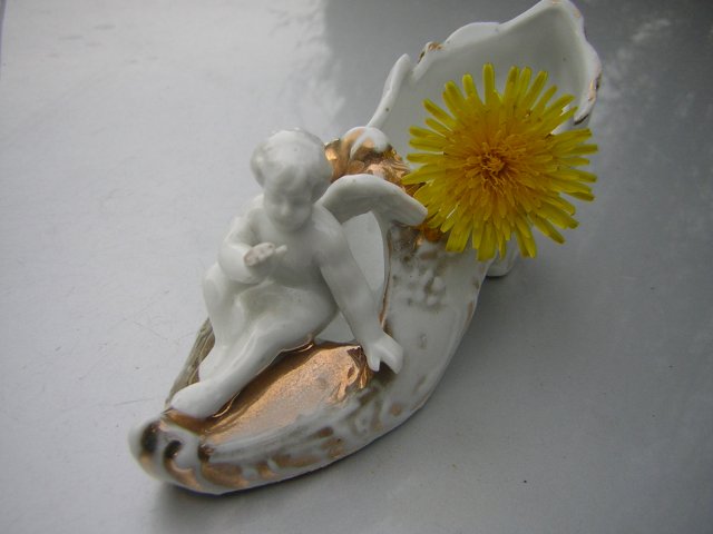Starej daty urocza rzecz. Złocenia nieco wytarte, skrzydełka końcówka zaginęła kiedyś tam. ..rączka przyszarzała...uroda rzeczy pozostała; ) Całkiem spory bucik porcelanowy, fakturowy, dźwięczący. Nie sygnowany. Anioł niczym na dziobie okrętu błogosławieństwo czyni. Wykończenie satynowo - błyszczące. 15,5 x 4,5 x 6,5 podstawa 12,5 x nie całe 5 cm Stan zachowania - przetarte złocenia, uszczerbek na anielim skrzydle. Bez pęknięć. Dobry. Urocza rzecz godna uchowania.