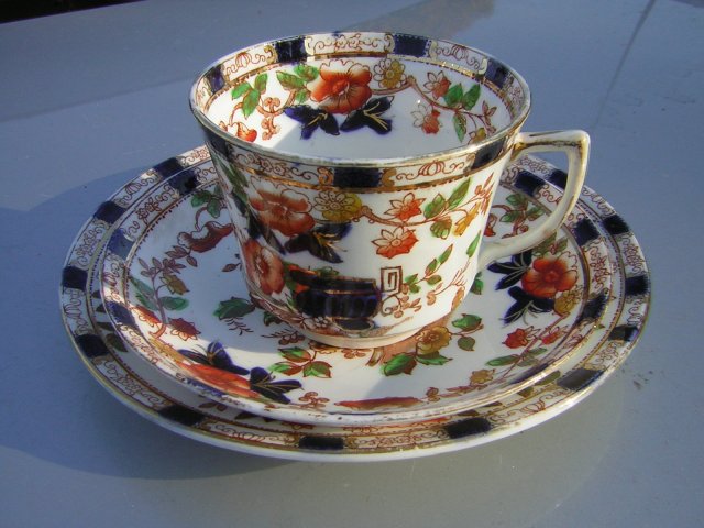 Zestaw śniadaniowy.Porcelanowy, elegancki, ręcznie podmalowywany. Rzecz starej daty z nieczyteknymi sygnaturami. .Spodek i filiżanka z prześwitującej pod światło porcelany, talerzyk nieco grubszy, mocniejszy. Śmietanowa biel, celastyczność nadruk i ręcznie dodany kobalt, ceglastą pomarańcz, zile, żółć i złoto. Jakość wykonania nie jest idealna, ale zestaw jest bardzo efektowny, elegancki....no i stary.Wykończenie satynowo - błyszczące.