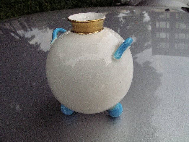 Absolutnie urocze połączenie kolorów - ciepłe ecru porcelany delikatnie kraklowane i na błyszcząco wykończone,złoty górny rancik i turkusowe błyszczące uszka i trzy kulki - nóżki .Niespotykany,ozdobny,użytkowy :) Uroczy :) Wystarczy jeden kwiatek i efekt murowany :)