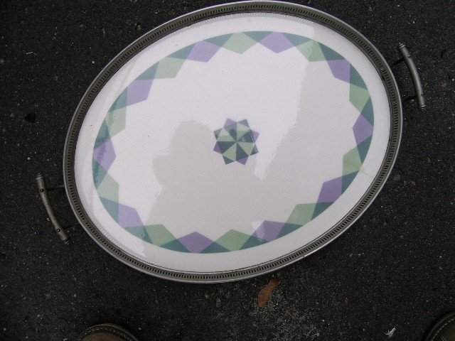 Duża Porcelanowo-Metalowa Taca z ażurową Galeryjką i wygodnymi uchwytami. Sygnowana WFM. Dec. 3191 i nr. 18 WAECHESENBACH i Foreign - zapis świadczący, że przedmiot został wykonany poza terytorium Wielkiej Brytani. Starej Daty to rzecz - zdobienie w stylu ART DECO, pewnie pochodzi z lat 30-40 - ych. Porcelanowe wypełnienie, na błyszcząco szlkiwione nieco kraklowanym szkliwem. Galeryjka i uchwyty delikatnie zdobione,nóżki - niewielkie kulki. pięknie wykonany metal w kolorze cyny. Nie wiem,czym jest.Cała Taca bardzo piękna i szlachetna. Bardzo ciekawa to rzecz :)