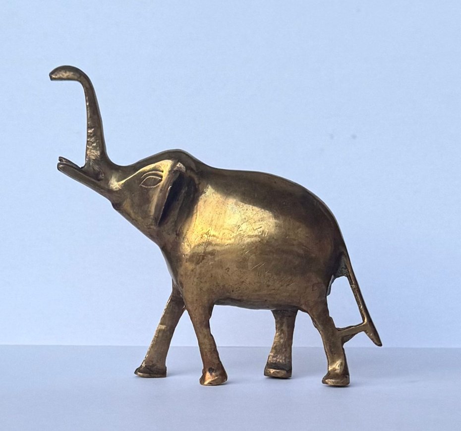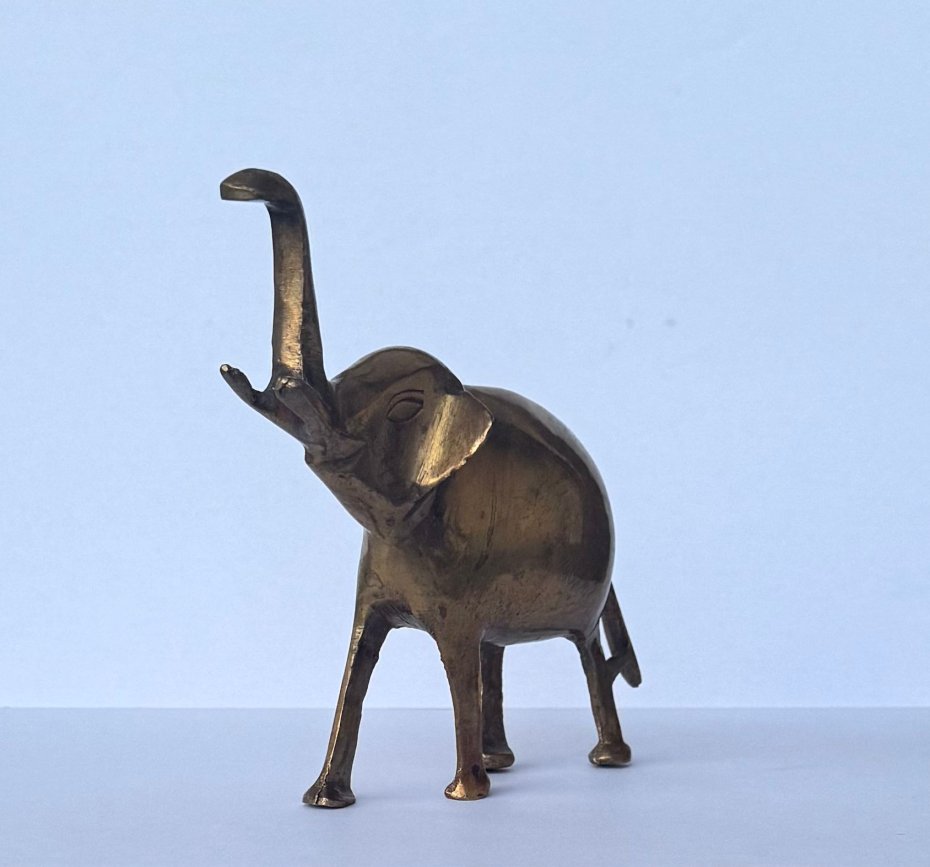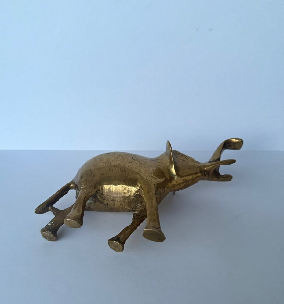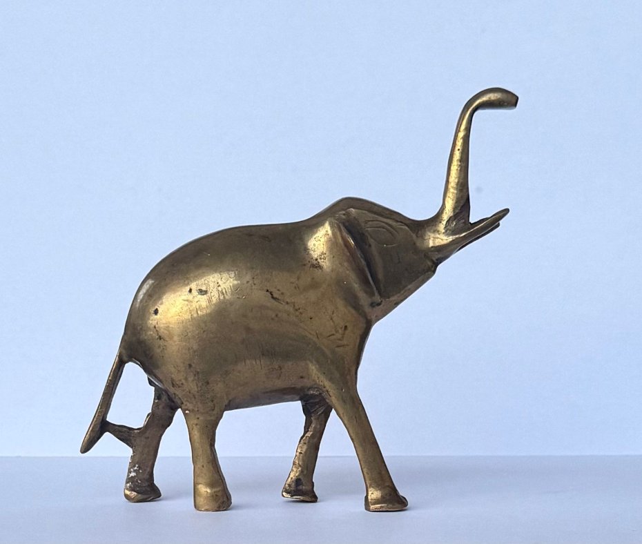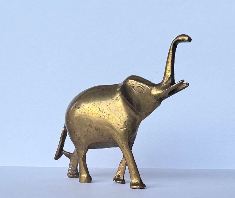 Stara, ciężka figurka słonika wykonana z lanego mosiądzu, pochodząca z drugiej połowy XX wieku. Przedmiot wyróżnia się solidnym wykonaniem oraz klasycznym, dekoracyjnym charakterem. Świetnie sprawdzi się jako ozdoba wnętrza lub element kolekcji przedmiotów vintage. Stan bardzo dobry, z naturalną patyną nadającą mu autentyczności i uroku.