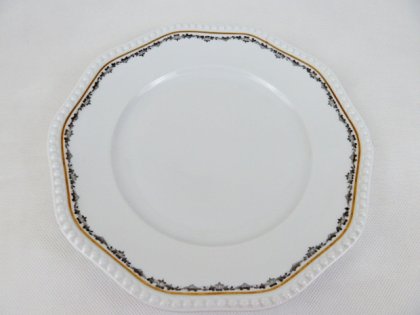 Talerz porcelanowy renomowanej wytwórni Rosenthal. Porcelana wysokiej jakości w kolorze białym z delikatnym wzorkiem w kolorze szarym oraz paskiem w kolorze złotym. Krawędzie nieregularne z wypustkami wielkości ziaren grochu. Pod spodem sygnatura podszkliwna z lat 1923-1925. Stan bardzo dobry wręcz wyśmienity jak na lata, z których pochodzi.