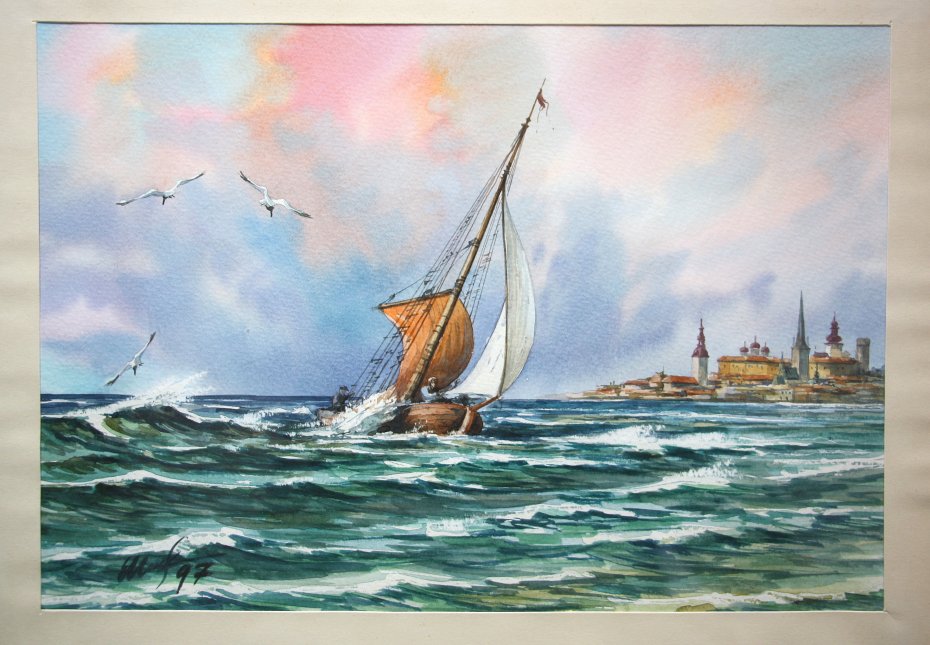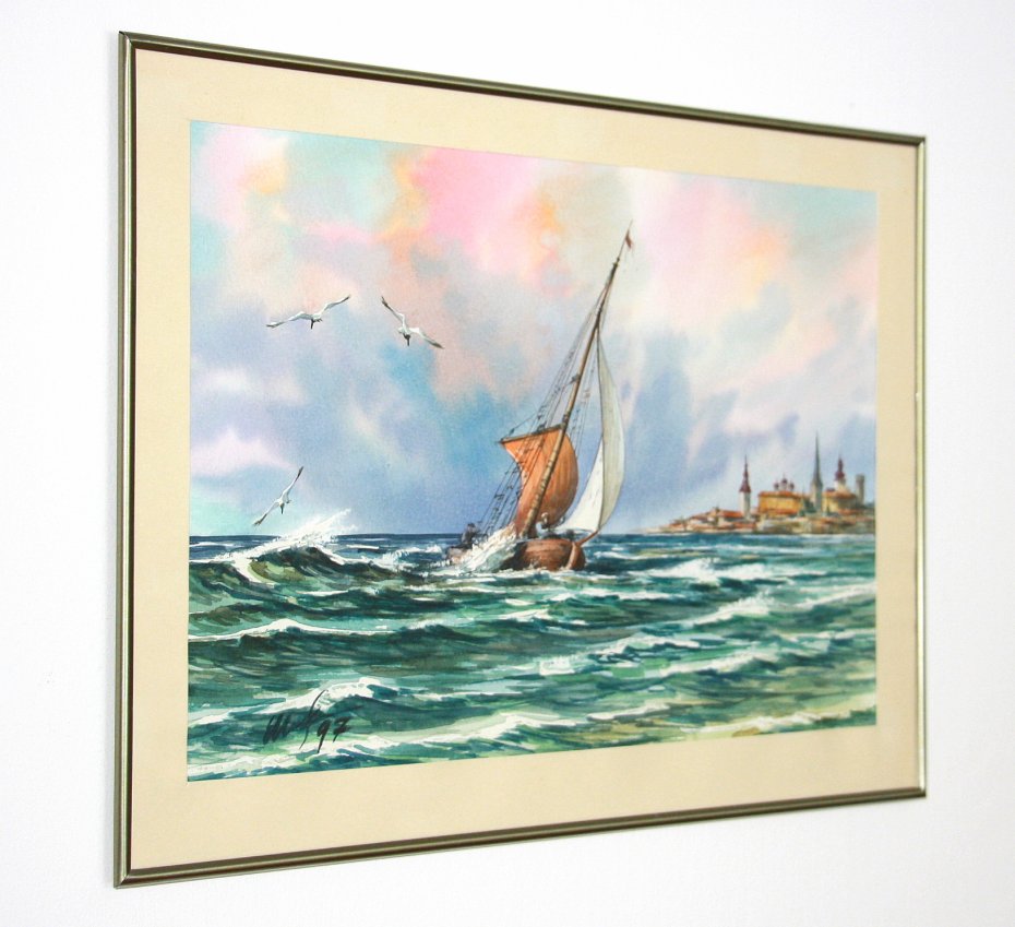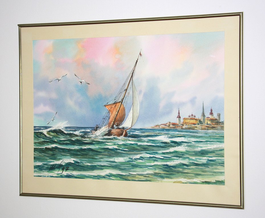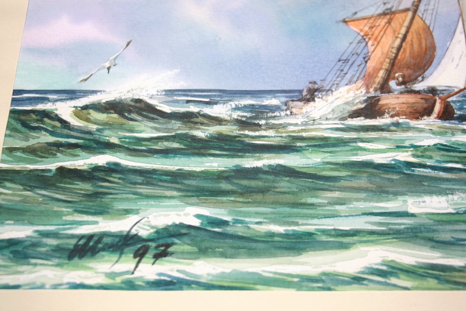 Oryginalny stary obraz, akwarela, marynistyka skandynawska. Oprawiony w metalową ramkę z szybą. Sygnowany z datą '97. W bardzo ładnym stanie.