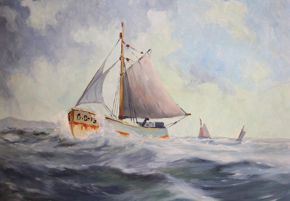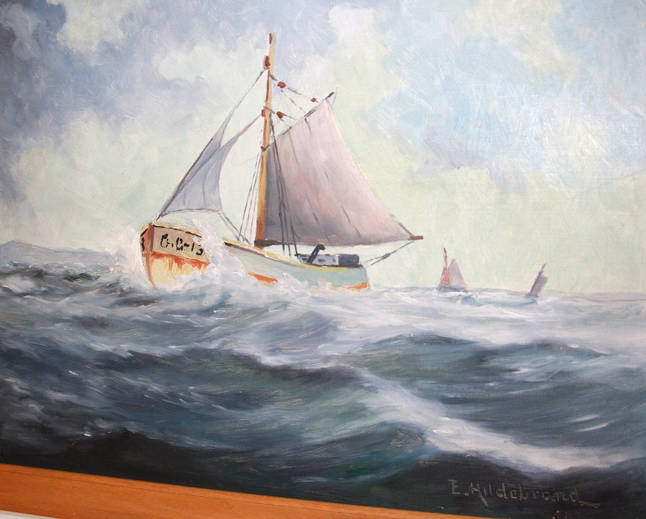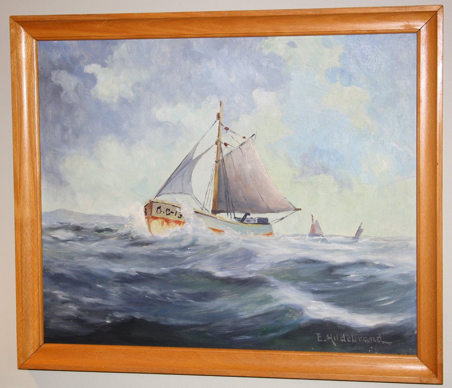Oryginalny stary obraz, marynistyka skandynawska. Olej na płycie. Oprawiony w drewnianą ramę. Sygnowany. W bardzo ładnym stanie.
