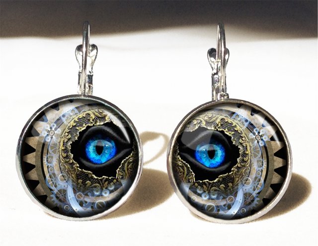 Ręcznie robione kolczyki wiszące z wysokiej jakości grafiką pokrytą wypukłym, powiększającym szkiełkiem.