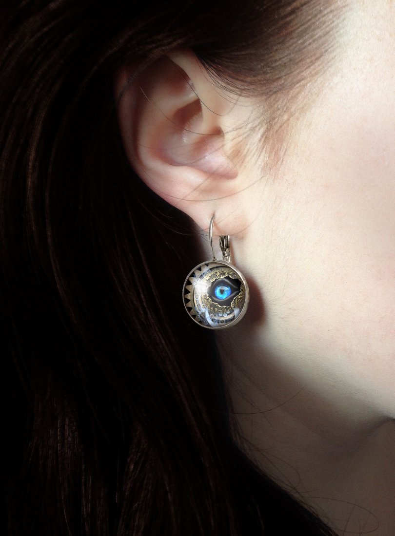Ręcznie robione kolczyki wiszące z wysokiej jakości grafiką pokrytą wypukłym, powiększającym szkiełkiem.