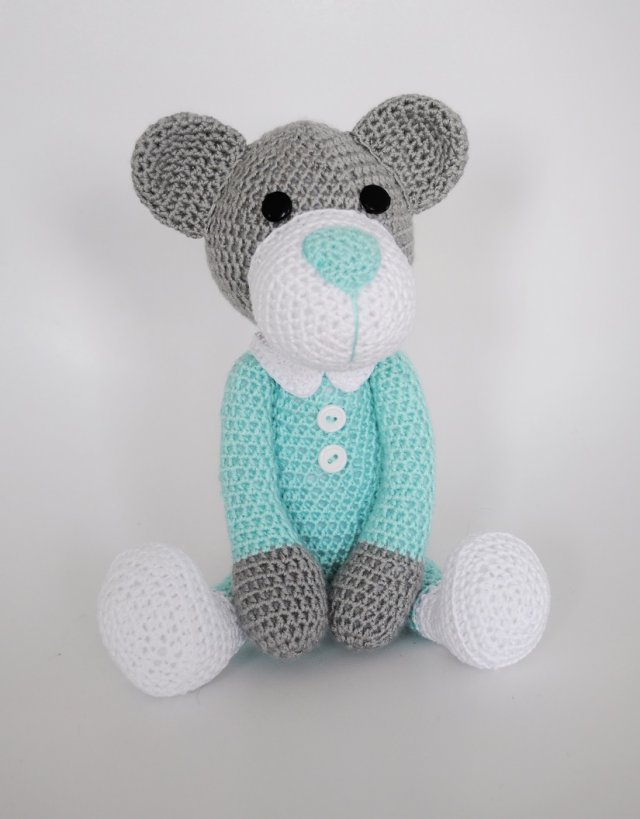 Stefan ma ok. 30cm wzrostu i szare umaszczenie. Misia wykonano z miękkiego akrylu i bawełny, wypełnienie to puch antyalergiczny. Kolory: szary, turkusowy, biały. Doskonała ozdoba pokoju dziecięcego. Całość wykonana ręcznie.