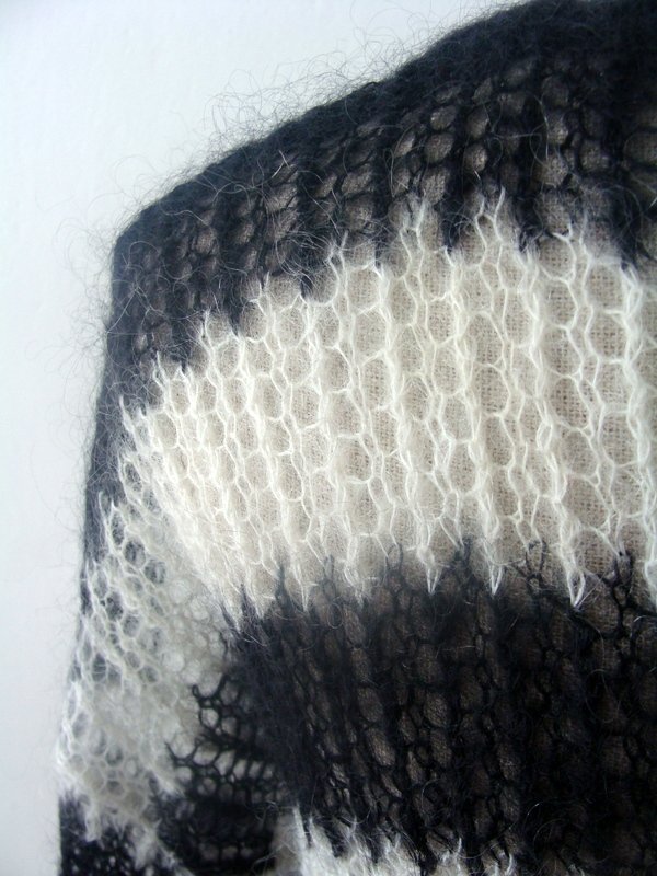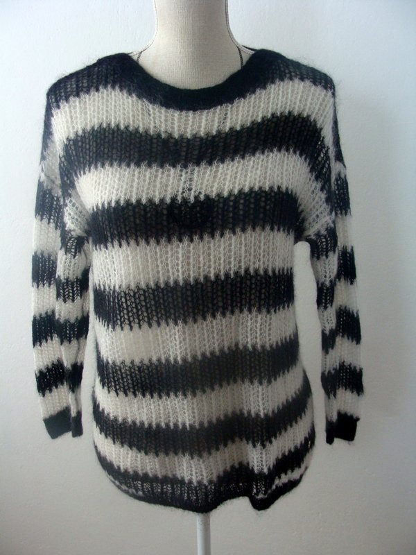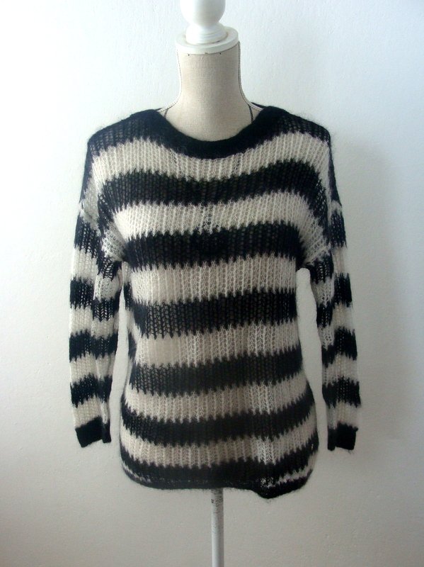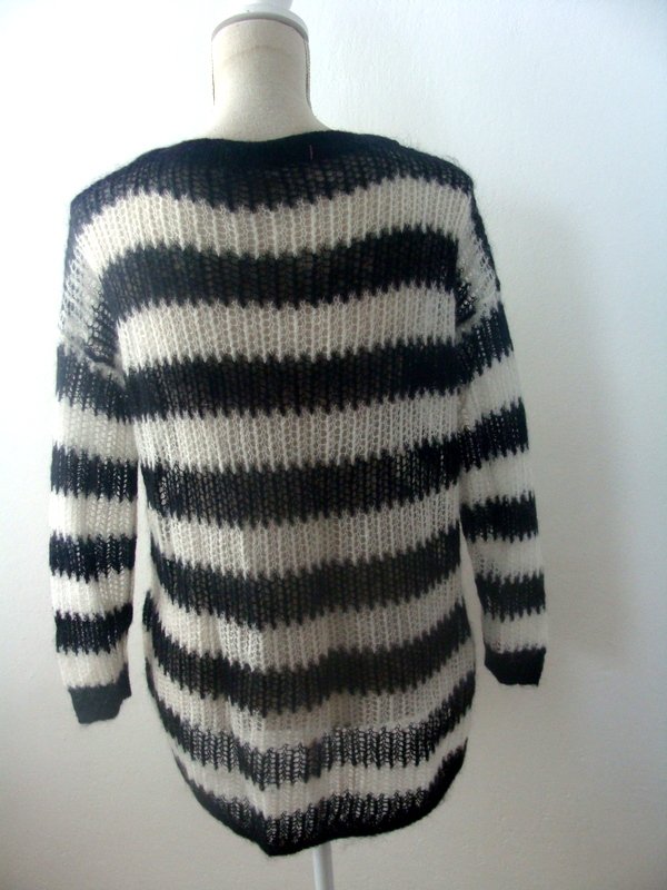 Ażurowy sweter z cienkiej włóczki moherowej z dodatkiem wełny i poliamidu w czarno białe pasy. Owalny dekolt, przód z łukowatym podkrojem u dołu nieco krótszy od tyłu.