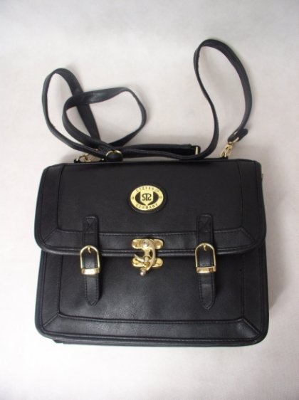 Torebka czarna firmy Stefano Germany.Skóra ekologiczna.Zapinana z przodu na skobelek.Z przodu ozdobiona dwoma paseczkami ze złotymi klamrami+logo firmy.Podszewka czarna.W środku pięć przegródek w tym trzy zapinane na zamek.Mała rączka do noszenia w ręku+długi pasek,regulowany,zapinany na karabińczyki.Stan bardzo dobry.Wysokość 24 cm,szerokość 29 cm.