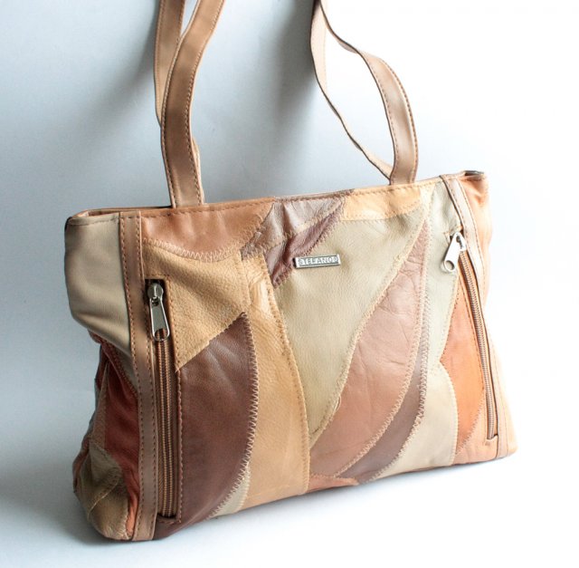 Patchworkowa torba w odcieniach beżu i brązu marki STEFANO. Wewnątrz podszewka z nadrukiem nazwy firmy. Stan: wygląda na nową.