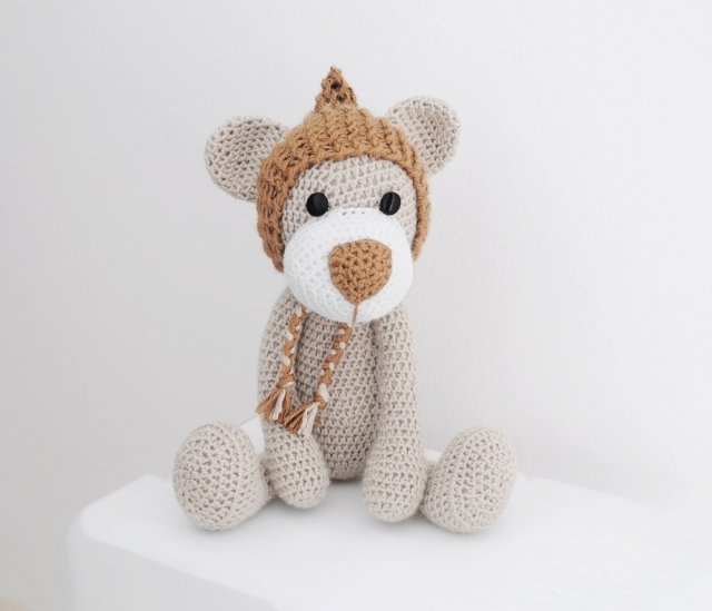 Stefka ma ok. 30cm wzrostu i beżowe umaszczenie. Dodatkową ozdobą misia jest czapka (czapka nie jest zdejmowana). Misia wykonano z miękkiego akrylu i bawełny, wypełnienie to puch antyalergiczny. Doskonała ozdoba pokoju dziecięcego. Całość wykonana ręcznie. Miś nie stoi samodzielnie.